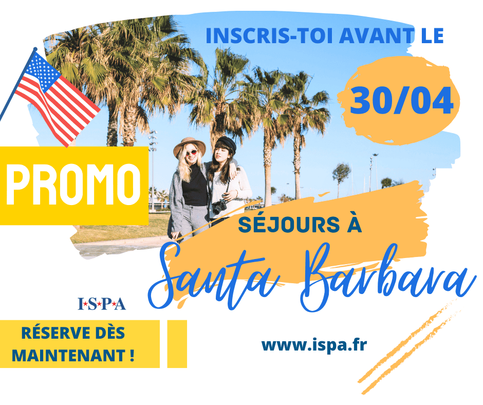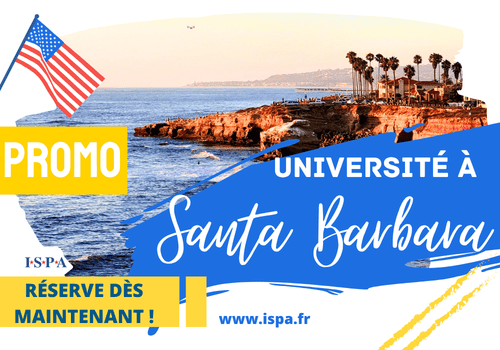 (*) Code promo C0122 à indiquer sur votre fiche d’inscription : offre valable pour un séjour d’une année ou d’un semestre académique pour la rentrée d’août 2026. Cette remise est accordée pour les programmes comprenant des cours d’anglais, soit 1 semestre de cours anglais, suivi d’un semestre universitaire ou 1 semestre d’anglais à Santa Barbara et pour une inscription reçue à l’agence avant le 30 avril 2026. Offre cumulable uniquement avec l’Offre « Flash » de 600€ sur Santa Barbara.